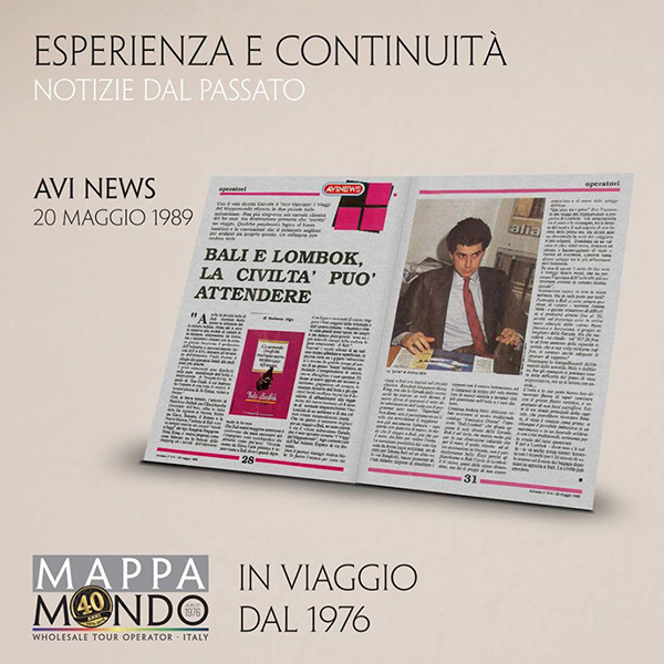 Quando si celebrano 40 anni ininterrotti di attività come tour operator, chapeau e la parola al fautore del successo di Viaggi del Mappamondo: “Sono orgoglioso di essere in questa azienda da 32 anni e di averla gestita con strategie chiare e precise, oltre che con una certa lungimiranza che, fin da subito, ci ha portato a specializzarci solo ed esclusivamente sul lungo raggio. Oggi rappresentiamo un caso, fra i pochissimi nel panorama del tour operating italiano, a poter vantare un simile traguardo” racconta con orgoglio il presidente e a.d. Andrea Mele. Che aveva visto lungo nel remoto 1989, quando dichiarava: “A Bali non diamo solo il pernottamento, ma arricchiamo la permanenza con qualcosa di nuovo, in modo che il viaggio, più che per il mare, sia fatto per vedere l’isola”. Turismo esperienziale ante litteram.