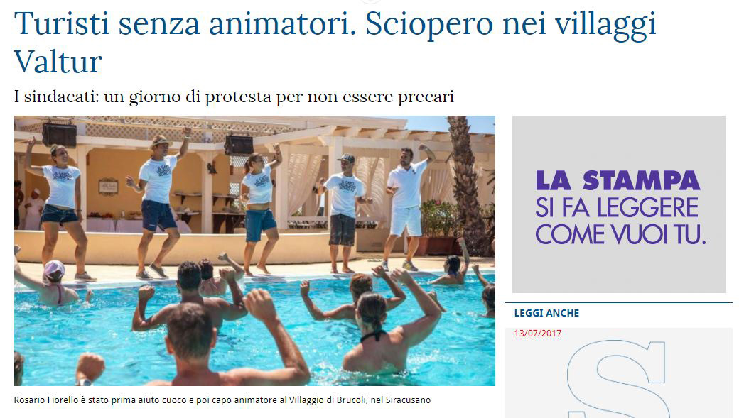 La Stampa, il glorioso quotidiano torinese, scrive volentieri di turismo, sia per tradizione (i piemontesi sono notoriamente grandi viaggiatori) sia per diffusione geografica (è leader di vendite in Val d’Aosta e Liguria). E di solito ne scrive con cognizione di causa, basta ricordare i tempi nei quali la famiglia Agnelli, con Ifil / Exor, era il primo azionista di Alpitour. Appare quindi insolita la “scivolata” pubblicata sul giornale del 27 luglio 2017. Titolo “Turisti senza animatori. Sciopero nei villaggi Valtur” a tutta pagina e tono tra l’allarmistico e il “vabbè, tanto si sa come vanno le cose in Italia, quando c’è di mezzo la finanza”. Sarà che l’autore scrive da Roma, lontana sia da Milano che da Torino. Comunque, lascio ai lettori di la libertà di farsi il proprio giudizio, per l’articolo basta cliccare qui. Pronta la replica di Valtur, che ovviamente ridimensiona l’episodio, e altrettanto la controreplica del giornalista, che para il colpo e la (ri)mette sul piano dei rapporti tra capitalista senza cuore (Valtur) e proletariato schiavizzato (“collaboratori”): leggere qui per capire.”